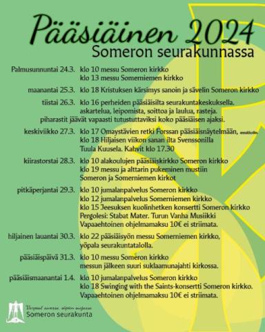 Someron seurakunna pääsiaisajan tapahtumat noudattelevat perinteistä kaavaa. Palmusunnuntain messussa  kello 10 Somerolla ovat mukana rippikoululaiset Perniö1-ryhmästä. Somerniemellä messu tavalliseen tapaan yhdeltä. Hiljaisen viikon maanantai-iltana Someron kirkossa pidetään ahtisaarna kello 18; Kristuksen kärsimys sanoin ja sävelin. Hiljaisen viikon tiistaina on perheiden aika siirtyä Matkalle pääsiäiseen. Perinteiseen askarteluiltaan seurakuntakeskuksella kello 17-19 on lisätty leipomista ja musiikkihetkiä yhdessä Martin musiikkikerholaisten kanssa. Pääsiäishuoneeseen pääsee tutustumaan ja seurakuntakeskuksen pihalle ilmestyy pääsiäisaiheisia rasteja. Piharasteihin voi käydä tutustumassa koko viikon, toiseen pääsiäispäivään asti. Keskiviikkona Omaystävät lähtevät retkelle Forssaan pääsiäisnäytelmään kello 17, matka on vain ennakkoilmoittautuneille. Svenssonilla pidetään Hiljaisen viikon sanan iltaa Tuula Kuuselan johdolla kello 18, kahvit klo 17.30.