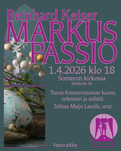 Turun konservatorion kuoro, orkesteri ja solistit, tuo Reinhard Keiserin Markus-passion Someron kirkkoon. Teoksen johtaa Maiju Laurila, urut.