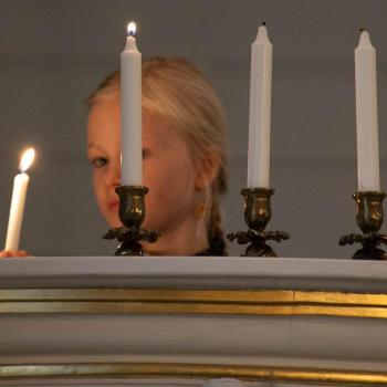 Pieta sytyttää ensimmäisen kynttilän adventtikynttelikköön.