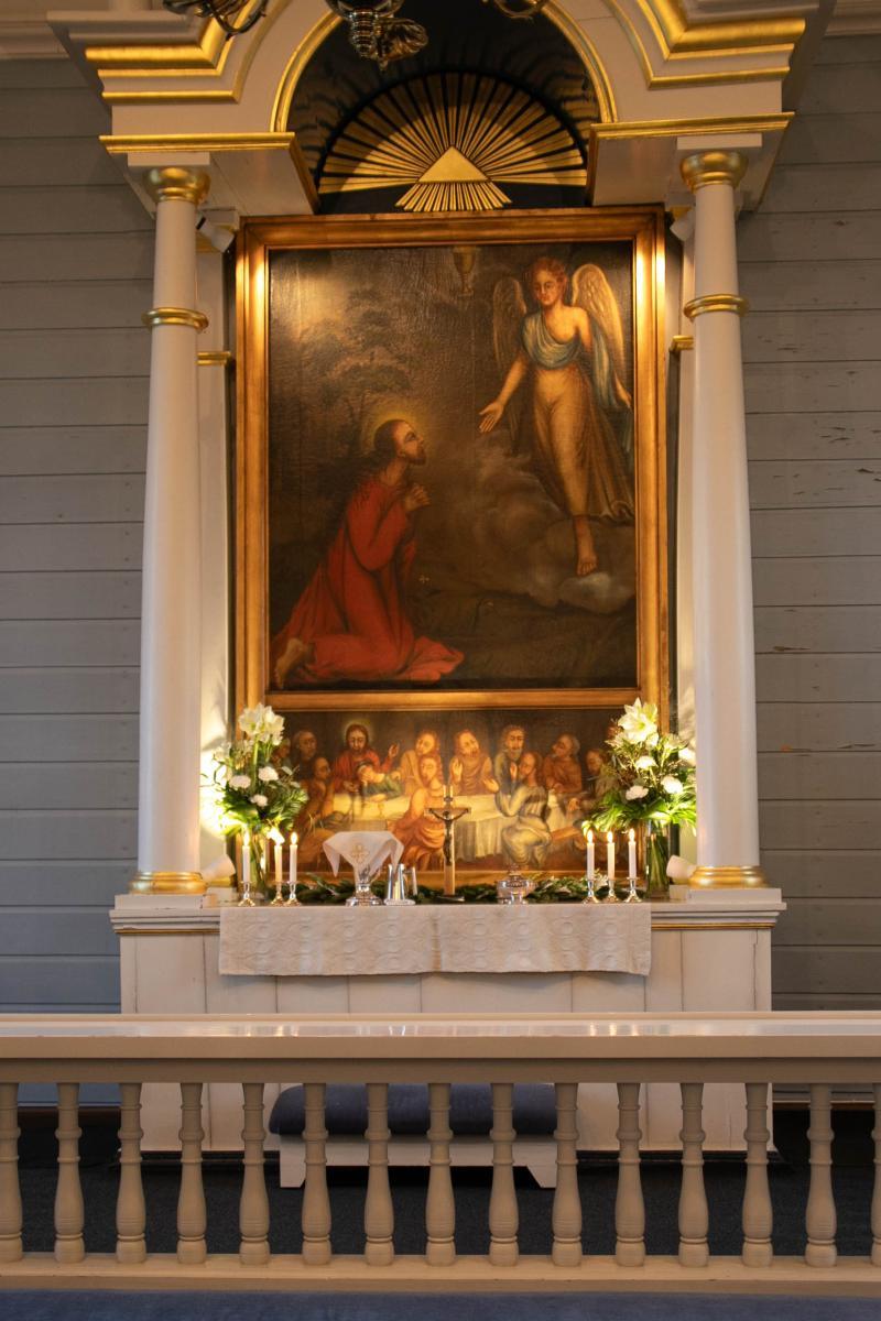 Alttari koristeltu kauniilla kukilla ja kynttilöillä