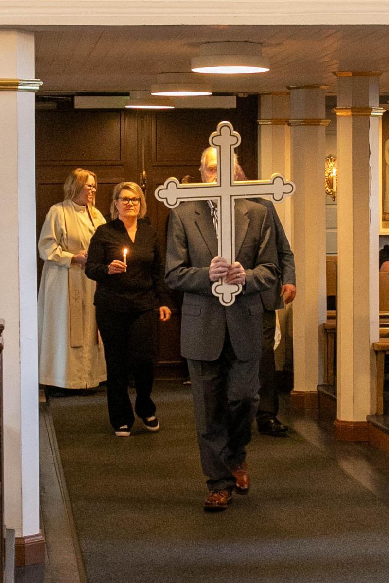 Tekstinlukijat Irina Ojala-Sirro ja Petri Känkänen seuraavat ristiä.