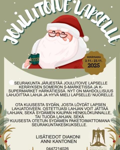Seurakunta järjestää joulutoive lapselle keräyksen. Sinulla on mahdollisuus lahjoittaa lahja ja hyvä mieli itsellesi, sekä lapselle/ nuorelle.
