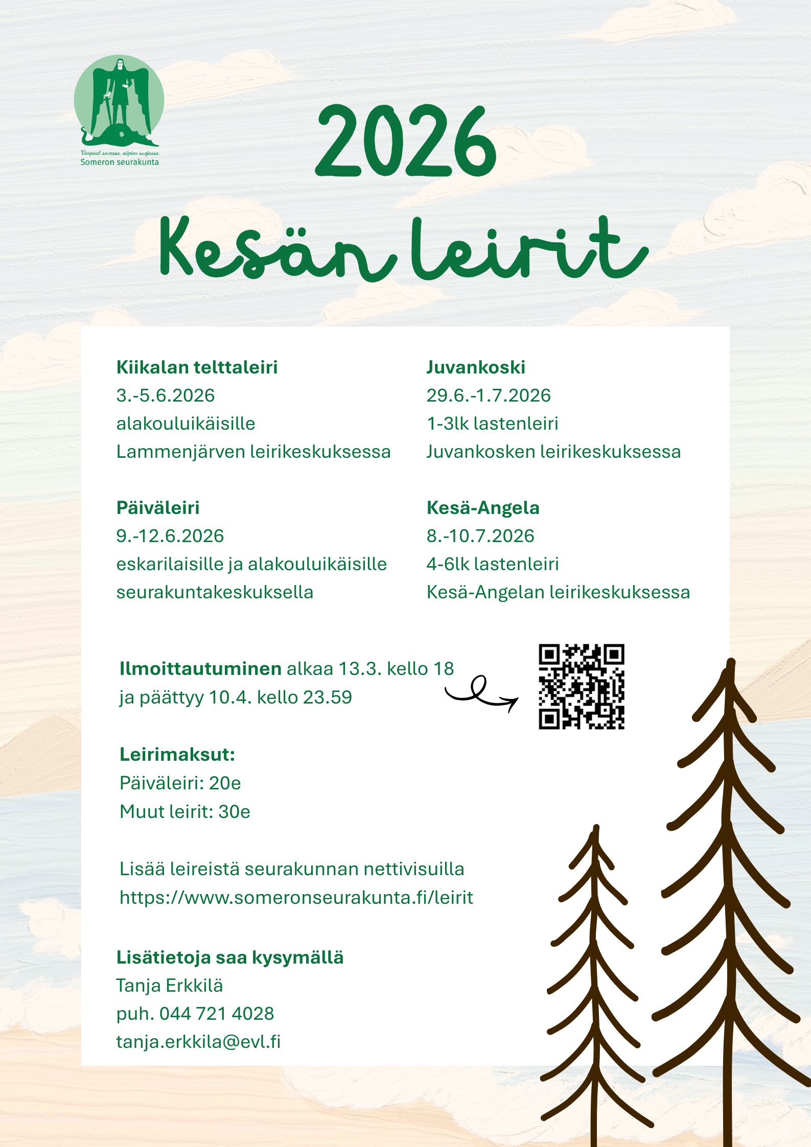 Leirimaksu on Someron seurakunnan jäseniltä 20 €. Muilta leirimaksu peritään kahdenkertaisena.