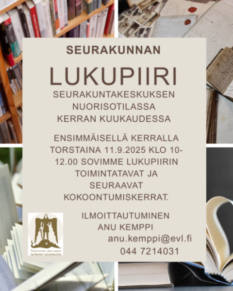 Tervetuloa lukupiiriin Someron seurakuntakeskuksen nuorisotilaan. Ensimmäinen tapaaminen on torstaina 11.9.2025 klo 10-12, jolloin sovimme jatkosta tarkemmin.