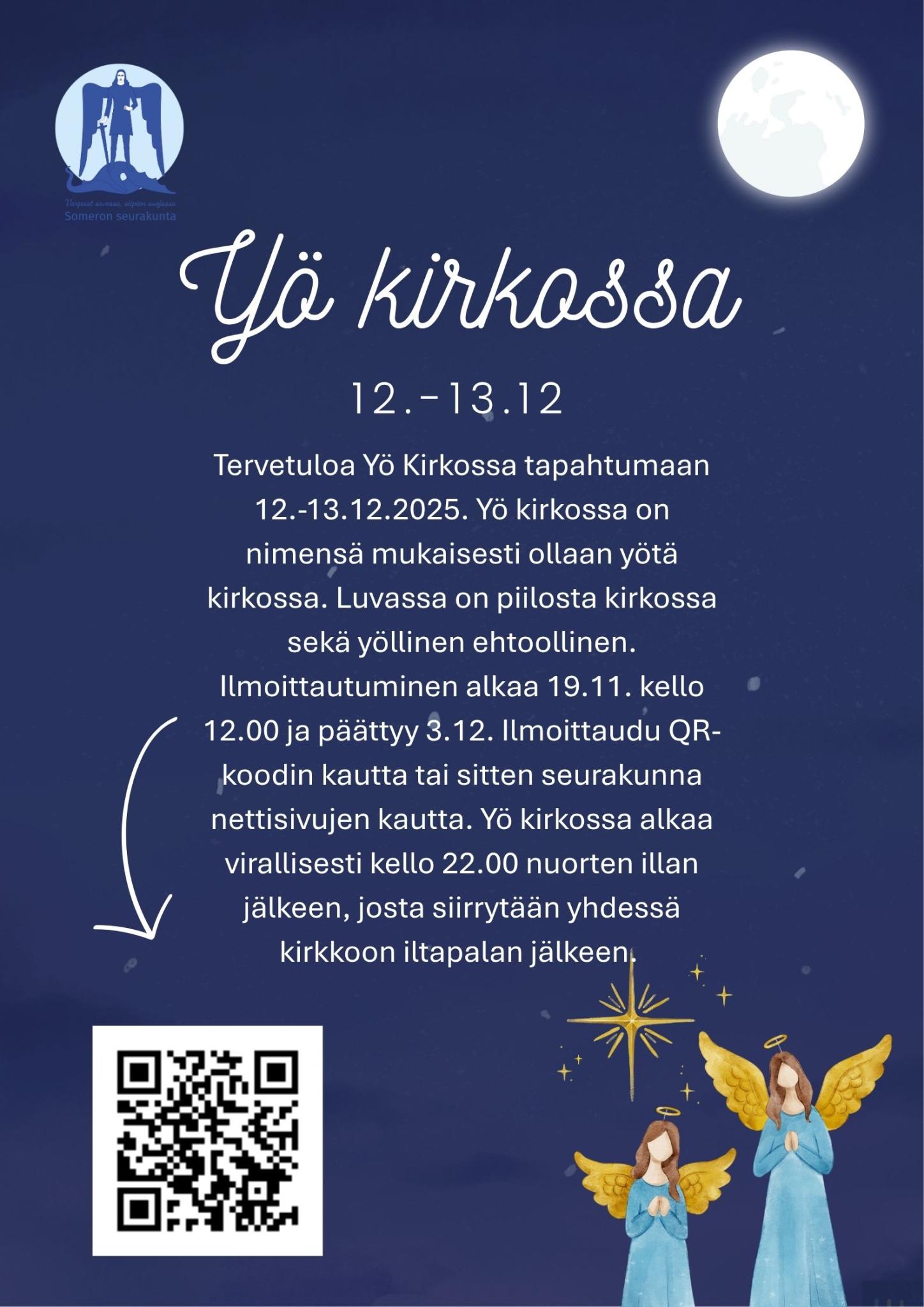 Someron kirkko avaa ovensa nuorille erityistä iltaa varten Nuorten Yö kirkossa kutsuu viettämään aikaa, leikkimään piilosta ja pysähtymään yölliselle yhteiselle ehtoolliselle. Nimensä mukaisesti tulemme nukkumaan kirkossa. Yö kirkossa alkaa nuorten illalla perjantaina, josta sitten nuorten illan päätyttyä ja iltapalan jälkeen siirrymme kirkkoon.